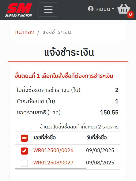 เลือกใบสั่งซื้อที่ต้องการชำระเงิน ยืนยันจำนวนเงินที่โอน และวันที่โอน